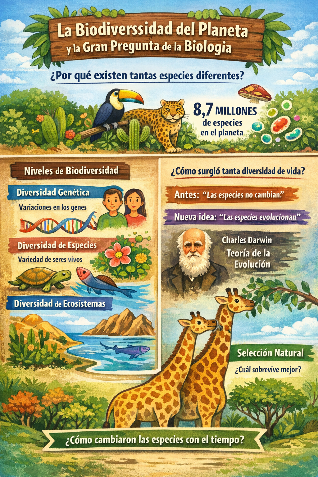 Comprender qué es la biodiversidad, reconocer la enorme variedad de seres vivos que existen en la Tierra y reflexionar sobre la pregunta científica que dio origen a la teoría de la evolución.