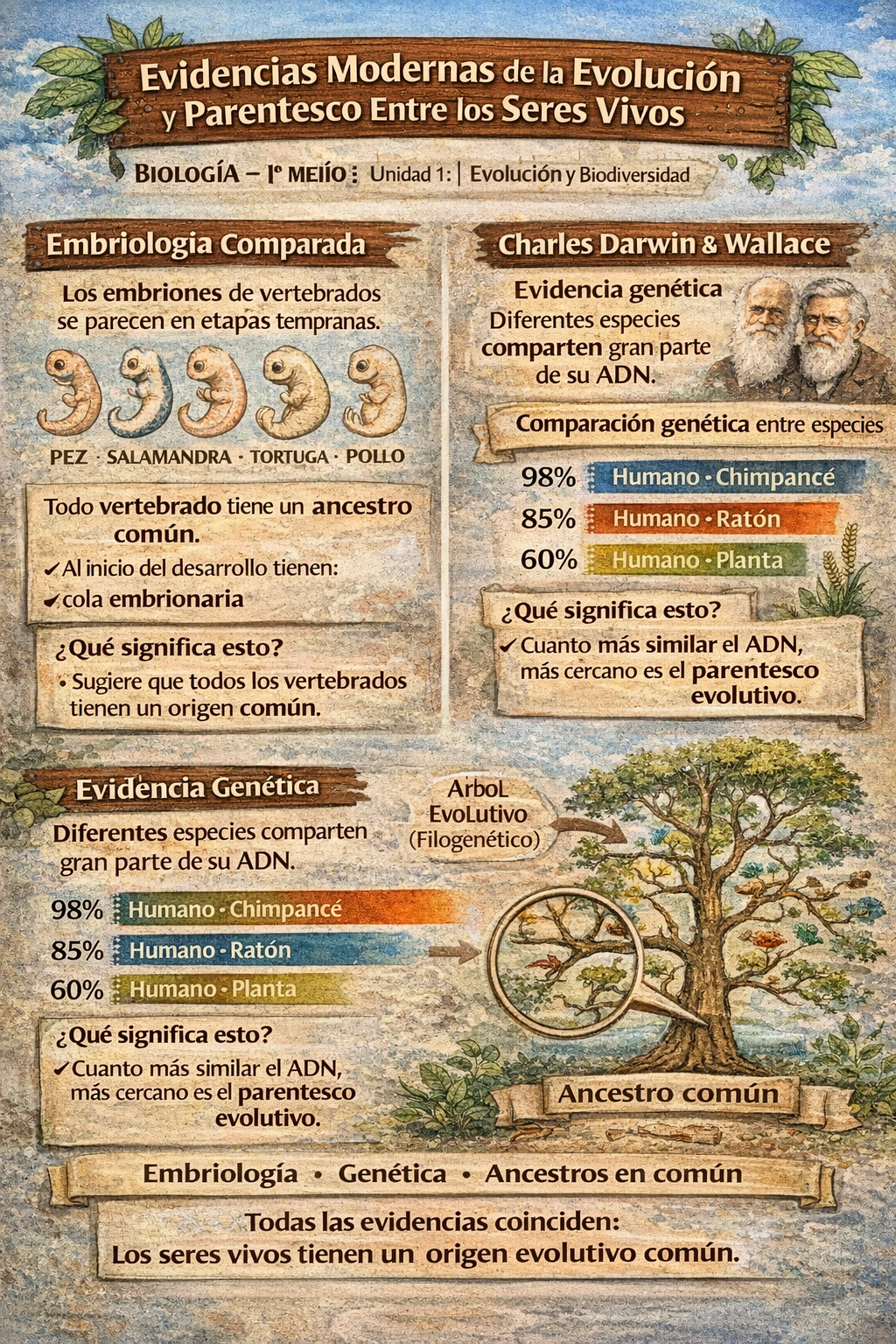 Comprender cómo la embriología, la genética y el análisis del ADN constituyen evidencias modernas de la evolución, y explicar cómo los científicos reconstruyen las relaciones evolutivas entre las especies.